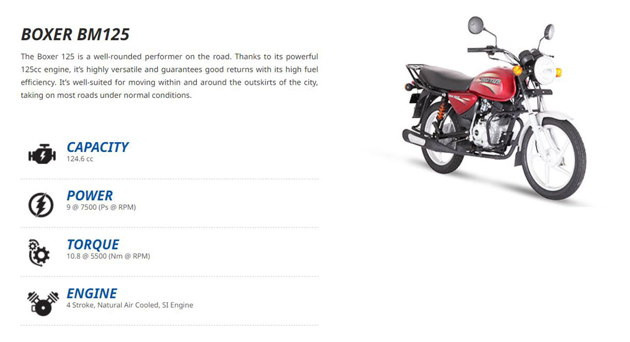 Boxer 125 imeundwa na injini ya 4-stroke, yenye silinda moja na mfumo wa kupoza kwa hewa, inayoweza kutoa nguvu ya juu ya 10 PS kwa 7500 rpm na torque ya juu ya 10.49 Nm kwa 5500 rpm. Injini hii ni ya aina ya SOHC yenye plug moja, ikitoa mchanganyiko bora wa nguvu na ufanisi wa mafuta. Pikipiki hii pia ina mfumo wa kuwasha kwa umeme (electric start) pamoja na kick start, ikirahisisha matumizi kwa mtumiaji.