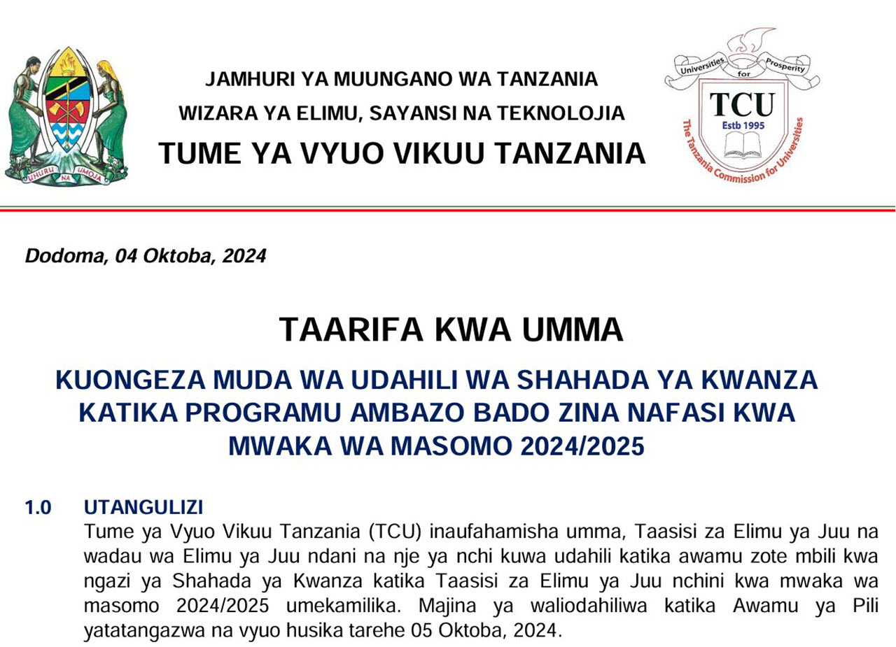 Tume ya Vyuo Vikuu Tanzania (TCU) imetangaza kufunguliwa kwa Dirisha la Tatu la Maombi ya Udahili kwa ngazi ya Shahada ya Kwanza kwa mwaka wa masomo 2024/2025. Dirisha hili linatoa fursa ya mwisho kwa waombaji ambao hawakuweza kupata udahili katika awamu zilizopita. Dirisha hili la udahili litakuwa wazi kuanzia tarehe 05 hadi 09 Oktoba 2024.