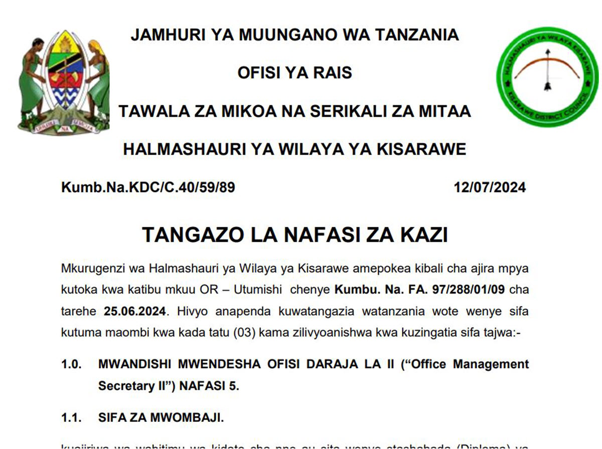 Halmashauri ya Wilaya ya Kisarawe Yatangaza Nafasi za Kazi (Mwisho 25/07/2024)