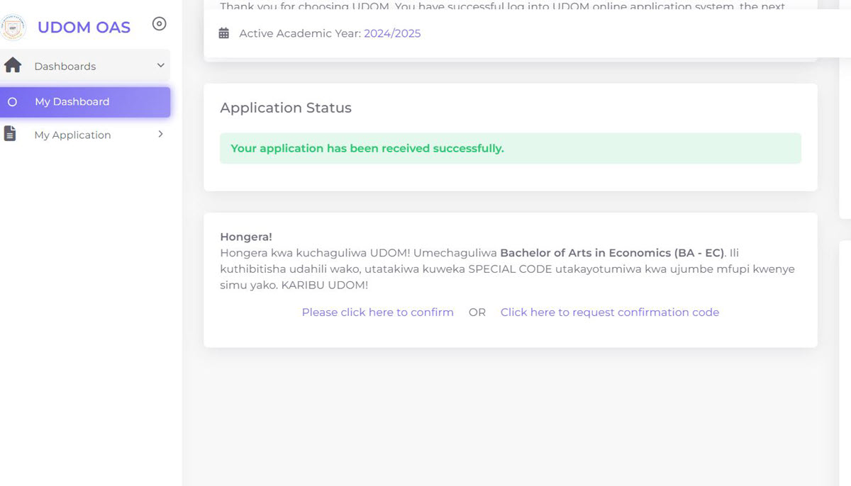 Baada ya kuingia kwenye akaunti yako, utaona ujumbe unaokujulisha kama umechaguliwa, pamoja na maelezo ya kozi uliyochaguliwa. Ili kuthibitisha udahili wako, utaingiza SPECIAL CODE utakayotumiwa kwa SMS.