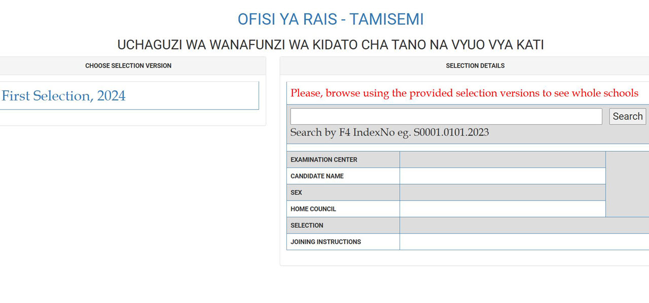 - Uchaguzi wa Kwanza; Hii ni orodha ya wanafunzi waliofanikiwa kupata nafasi katika shule za kidato cha tano. Wanafunzi hawa watalazimika kuchukua hatua kama vile kupakua barua ya kujiunga na shule zao na kujiandaa kwa ratiba ya kuripoti.
