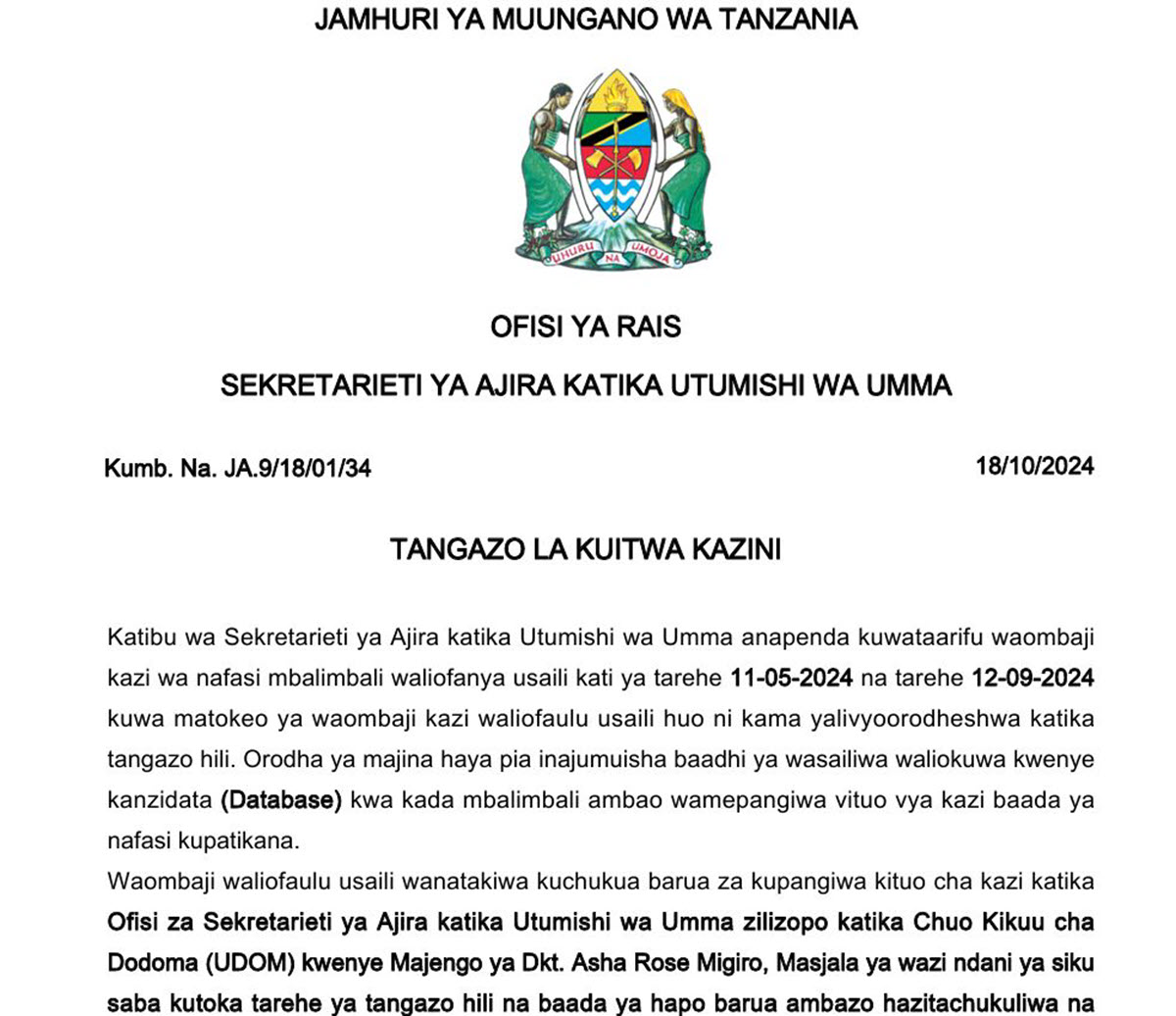 Waombaji waliofaulu wanapaswa kuchukua barua zao za kupangiwa kituo cha kazi katika Ofisi za Sekretarieti ya Ajira zilizopo Chuo Kikuu cha Dodoma (UDOM), Majengo ya Dkt. Asha Rose Migiro, ndani ya siku saba kutoka tarehe ya tangazo (Oktoba 18, 2024). Wale ambao hawatachukua barua zao ndani ya muda huu, barua hizo zitatumwa kupitia anuani zao za posta.