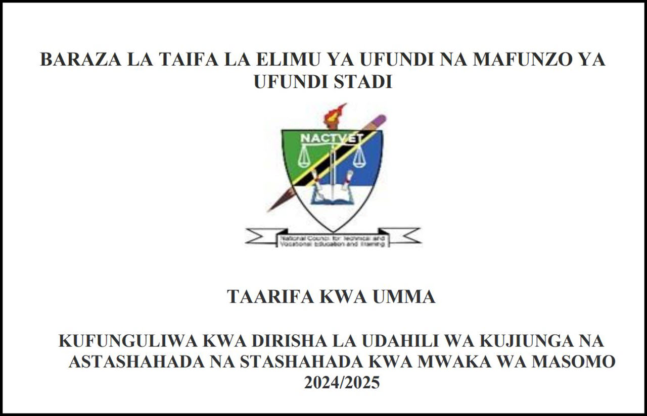 National Council for Technical and Vocational Education and Training (NACTVET) inatoa fani mbalimbali ikiwemo uhandisi, teknolojia, kilimo na biashara. Elimu ya ufundi stadi itakayokupa ujuzi wa vitendo unaohitajika sana katika soko la ajira la sasa. Hii ni fursa ya kipekee ya kutimiza ndoto zako na kujipatia ujuzi utakaokuwezesha kuajiriwa au kujiajiri. Usisubiri hadi dakika ya mwisho, chukua hatua sasa na utume maombi yako leo! Fursa hii ya kipekee ya kubadilisha maisha yako inakusubiri, usikose!