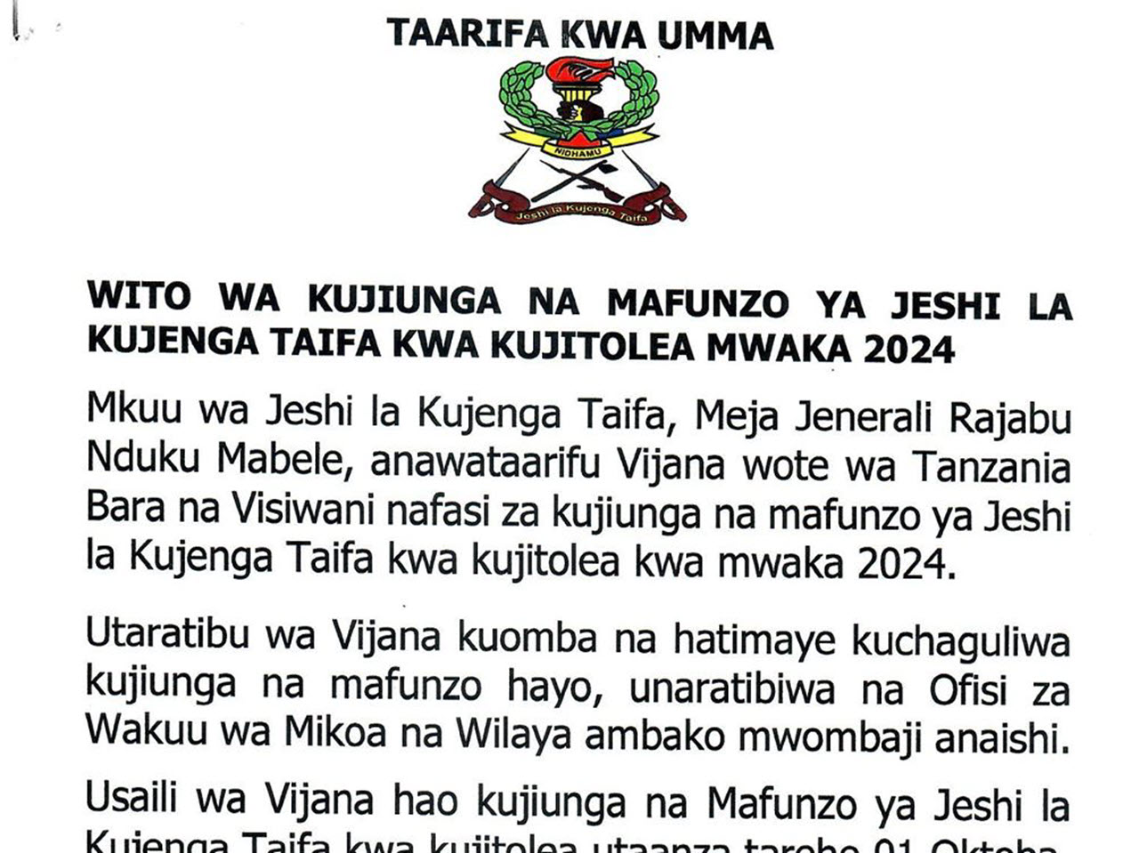Dodoma, Tanzania – Jeshi la Kujenga Taifa (JKT) limetangaza nafasi mpya za kujiunga na mafunzo ya kujitolea kwa mwaka 2024. Nafasi hizi ni kwa vijana wote wa Tanzania Bara na Zanzibar na lengo ni kuwajengea uzalendo, umoja wa kitaifa, na kuwaandaa kwa stadi za maisha na kazi. Usajili utaanza rasmi tarehe 1 Oktoba 2024, ambapo vijana waliohitimu elimu ya msingi, sekondari, vyuo vikuu, na wale wenye shahada ya uzamili wanakaribishwa kuomba. Hii ni fursa kubwa kwa vijana wa Kitanzania kujifunza na kuchangia katika ujenzi wa taifa.