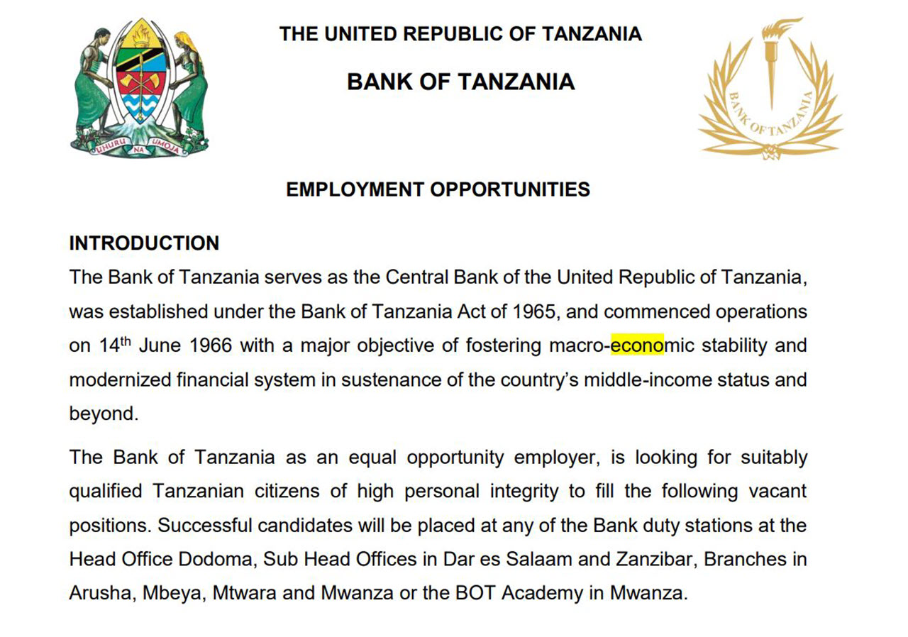 Maelezo ya Jumla ya Nafasi za Kazi Zilizotangazwa benki Kuu ya Tanzania