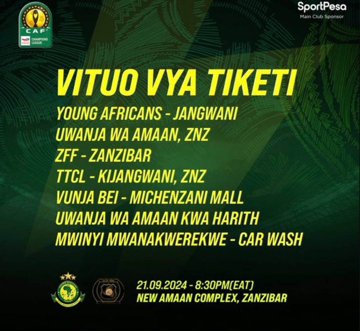 Vituo Vya Kukata Tiketi Mechi ya Yanga Vs CBE 21/09/2024